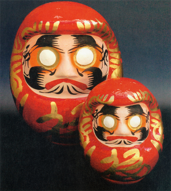 白河だるまは、「白河鶴亀松竹梅だるま(しらかわつるかめしょうちくばいだるま)」とよばれ、眉(まゆ)はツル、口ひげはカメ、鬢(びん)【頭の左右のわきの部分の髪(かみ)】は梅、あごひげは松が描かれ、さらに顔の下には竹を模様化しています。顔が見るからにふっくらとしていて幸福そうで、おめでたい感じがします。京のはなやかな美しさがあるのも、みちのく民芸(みんげい)にはめずらしいです。身近な縁起物(えんぎもの)、願いがかなえられるだるまとしても広く親しまれています。商売繁盛(しょうばいはんじょう)・家内円満(かないえんまん)・合格祈願(ごうかくきがん)などの願いをだるまにたくして片方の目を入れ、願いがかなった時にもう片方に目を入れる風習がのこっています。