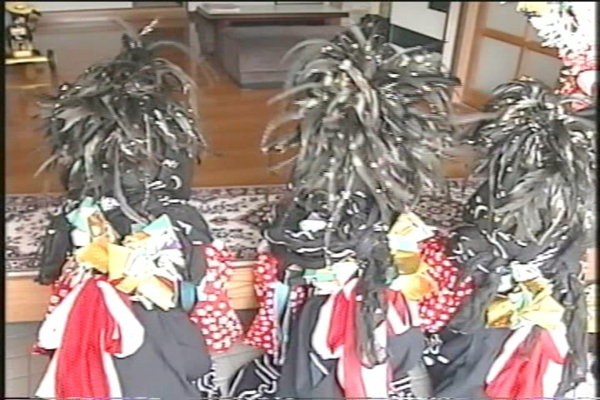 三匹の獅子の名前は、太郎獅子(たろうしし)、次郎獅子(じろうしし)、雌獅子(めじし)です。獅子は三匹ともにわとりの尾のはねをつけ、前ぼうとよぶ藍(あい)色の上にぼたんの花をそめぬいた麻(あさ)の布(ぬの)をかぶり、うすい黄色に唐草(からくさ)風な染付け(そめつけ)の単衣(ひとえ)の着物に袴(はかま)をはき、白たびにわらじばき、というすがたでおどります。